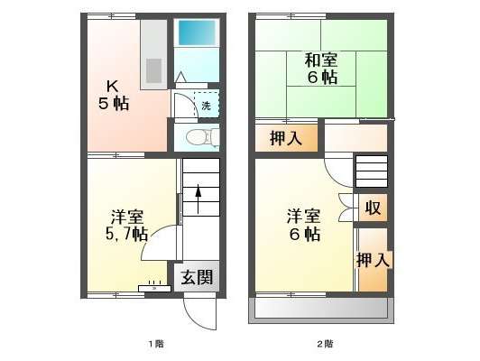 | 詳細間取 | 3K (洋5.7帖×1、洋6帖×1、和6帖×1、キッチン5帖) | ||